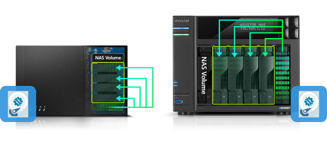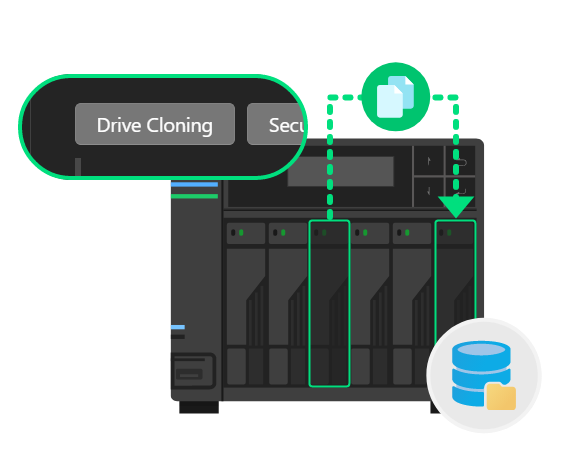NAS 내에 두 개 이상의 빈 베이가 있으면 하드 드라이브나 SSD 의 모든 데이터를 동일한 유형과 용량 또는 더 큰 용량의 다른 드라이브로 완전히 복사할 수 있습니다. 이를 통해 데이터를 보존하거나 백업할 수 있습니다.